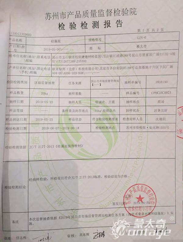 2019年5月,昆山市市場監(jiān)督管理局對蒙太奇硅藻泥產(chǎn)品進行監(jiān)督抽查。檢驗檢測結(jié)果顯示,蒙太奇硅藻泥產(chǎn)品未檢測出游離甲醛含量、可溶性重金屬以及苯、甲苯、乙苯、二甲苯有害物質(zhì)。