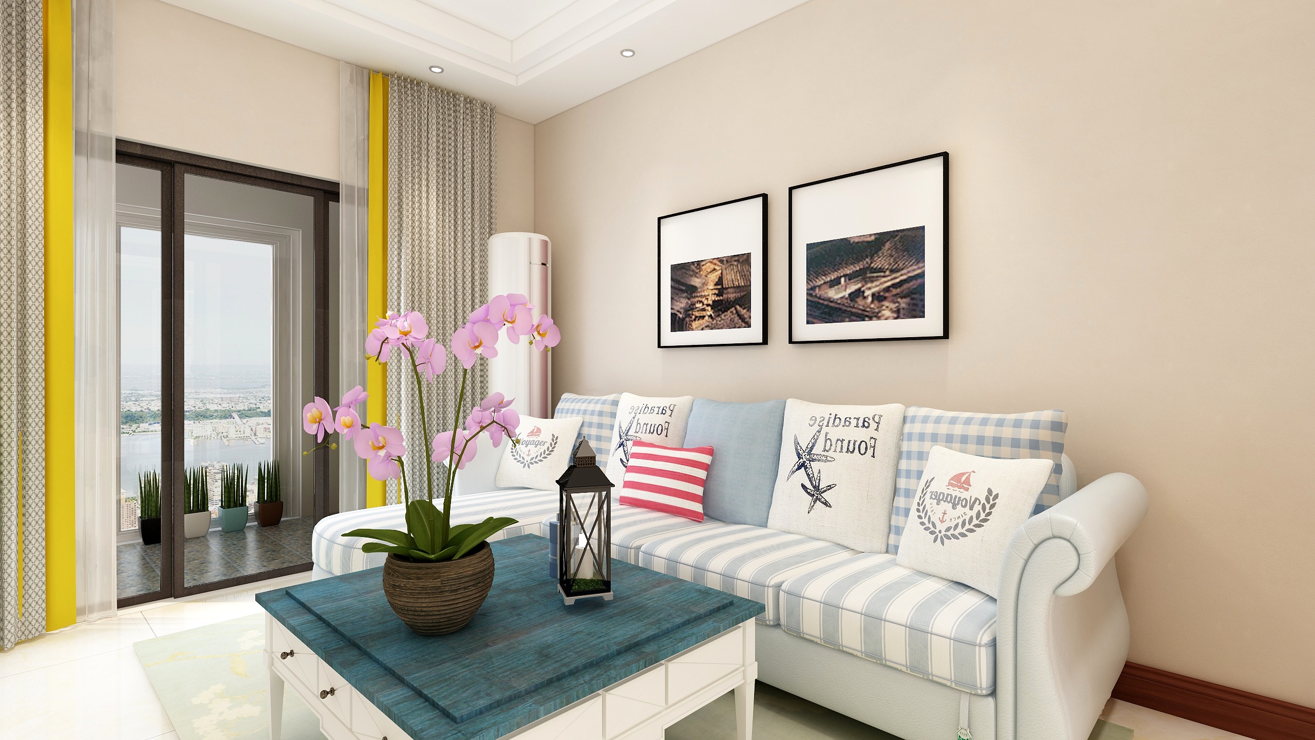 舒適、溫馨的色彩搭配,簡潔、明亮、光鮮,使人身處其中更加放松。加以黃色的點綴,使整體更加清新、富有活力。淺粉色的盆栽散發著馨香,令人好像漫步在公園中,柔和的視覺效果布局合理不單調。淺藍與白色相間的布制沙發,即樸實又干凈整潔大方。質感的踢腳線增添客廳高級的氣質。