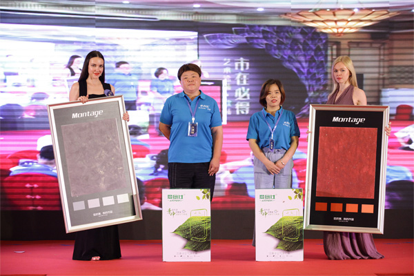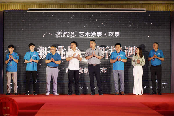 此次活動很大亮點當數新品發布。現場,中國建筑裝飾裝修材料協會硅藻泥分會朱秘書長、蒙太奇董事長趙廣全攜公司高層領導、優秀經銷商代表依次登臺,伴隨音樂,共同按下啟動按鈕。當主屏幕蒙太奇新品發布會主形象呈現時,預示著蒙太奇新品將正式與大家見面。