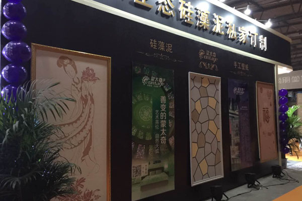 【陳總】:我們的主題是私家定制。特點(diǎn)就是我們將蒙太奇硅藻泥與手工壁紙相結(jié)合,推出的新品既有手工壁紙的奢華感,同時(shí)又具備著蒙太奇硅藻泥的所有特性。我們的展廳搭建出新的VI感覺(jué),讓人整體感覺(jué)特別高端;用蒙太奇硅藻泥打造的門(mén)頭立體浮雕特別吸引眼球,然后展廳里面所有的區(qū)域劃分非常完美。我們布展亮點(diǎn)在于頂面采用精工鑄造的藍(lán)天白云和珠光三色的搭配。