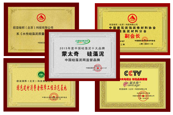 正式經過多年來不懈努力,致使蒙太奇品牌獲得多個榮譽資質,如:硅藻泥行業十大品牌、硅藻泥材料分會副會長單位、《水性硅藻泥質量標準》參編單位、綠色建材消費者保障工程示范基地、CCTV展播品牌、《硅藻泥裝飾材料應用技術規程》編制單位等。