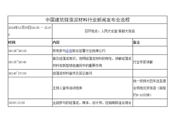 ? ? 在住房和城鄉(xiāng)建設部、環(huán)境保護部的指導下,中國建筑裝飾裝修材料協(xié)會硅藻泥材料分會定于2014年11月19日14:30到21點在人民大會堂召開“中國建筑硅藻泥材料行業(yè)新聞發(fā)布會”。